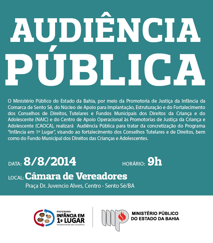 AUDIÊNCIA PÚBLICA REFERENTE AO PROGRAMA INFÂNCIA EM 1º LUGAR SERÁ REALIZADA NA CIDADE DE SENTO SÉ – BA.